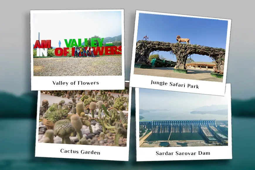 Popular attractions include Valley of Flowers, Jungle Safari, Cactus Garden, Butterfly Garden, and the Sardar Sarovar Dam viewpoint.