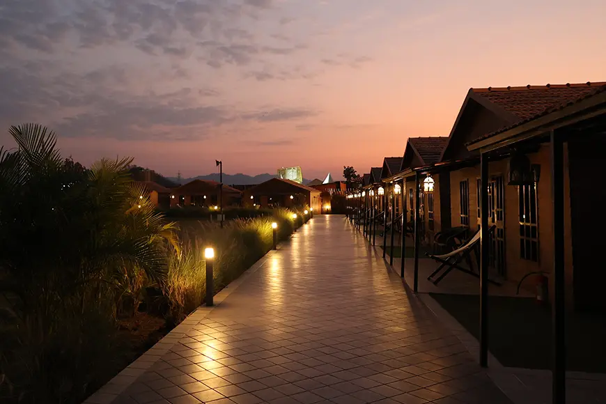 At Statue of Unity Tent City-1, guests stay in elegant cottages surrounded by greenery and peaceful landscapes. The property is designed to give visitors a relaxing break from their busy schedules.