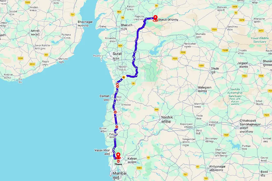Distance and Travel Time from Thane to Statue of Unity